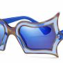 Gli occhiali rivisitati da Safilo rispettano il primo esemplare, riadattandolo alla contemporaneità attraverso l’iconica silhouette a farfalla in acetato blu, con lenti specchiate in tono e profili a contrasto brown che donano all’occhiale i magici riflessi delle acque della laguna.
